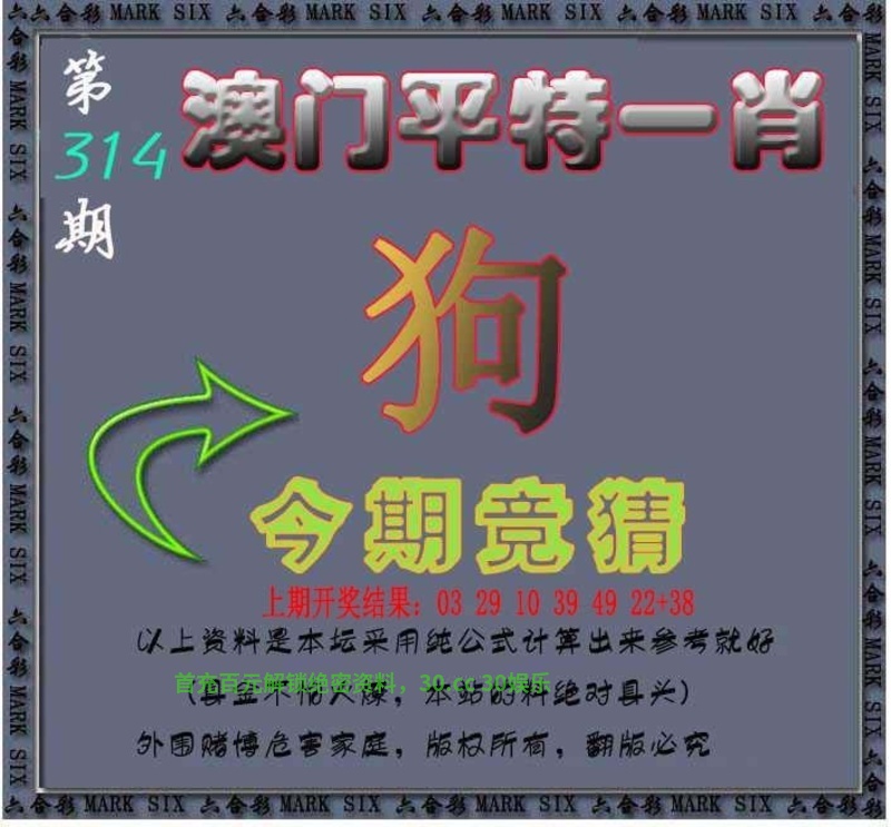 | 314期九肖 | 猪狗羊马虎牛鸡猴鼠 | 開:羊23 |